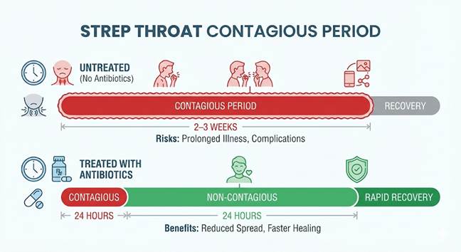 Strep throat is more than just a pain in the neck—it is a highly contagious bacterial infection that requires responsible management. The difference between a 3-week contagion window (untreated) and a 24-hour window (treated) is massive for your family, your workplace, and your community.